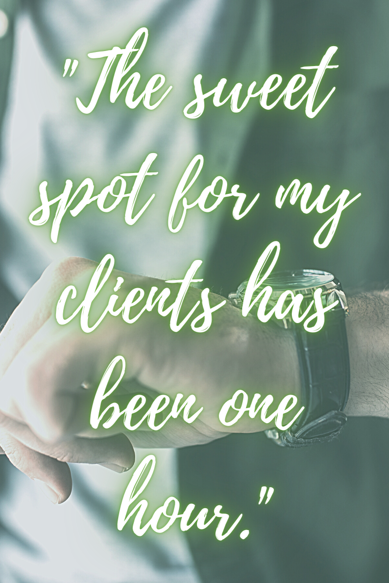 The sweet spot for my clients has been one hour. With fifty minute sessions, the most effective working time is very limited. It takes ten to fifteen minutes to go over what has happened since the last session and what a client is experiencing currently. Another ten to fifteen minutes is spent safely bringing the session to a close, taking care of housekeeping such as such as homework, and booking next sessions. This means before even starting the deep healing work clients have come for, forty to sixty percent of the available time is already used up.